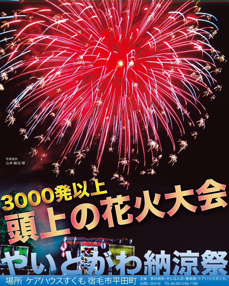 やいとがわ実行委員会がケアハウスすくもの駐車場にて納涼祭花火大会を開催する。集まった資金で運営費や花火にかかる費用の補填を行ないます。