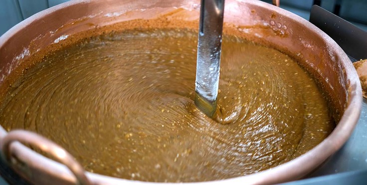 【工程1】味噌造り:伝統の甘みそをベースにくるみやごまを加えグツグツ煮込みます