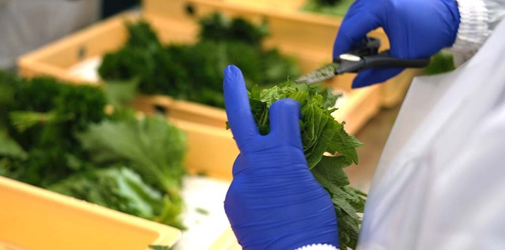 【工程2】しその葉を切る:通常よりも2倍以上大きい特注のしその葉を手巻きしやすいように茎の部分のみ裁断します