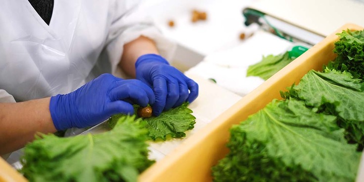 【工程6】しそ巻きを詰める:手巻きしているため1つとして同じ形のしそ巻きはありません。パックのサイズに合わせるように1本1本丁寧に詰めていきます