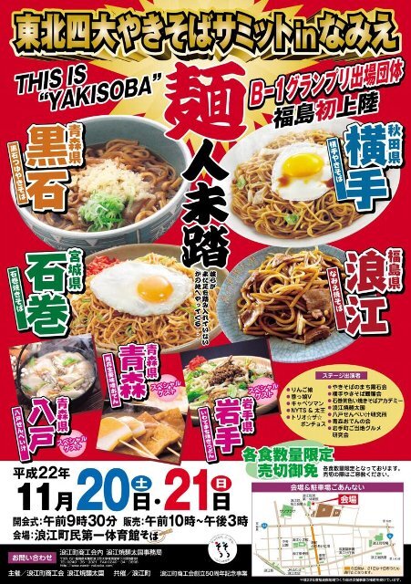東北のやきそばでまちおこしをする団体が、浪江町に一堂に会し、黒石つゆやきそば(青森県黒石市)、横手やきそば(秋田県横手市)、石巻焼きそば(宮城県石巻市)、なみえ焼そば(福島県双葉郡浪江町)を提供しました。当時人口21,000人のまちに、2日間で約30,000人が訪れ、町内に大渋滞ができ、提供食材が全てなくなるほど大盛況でした。