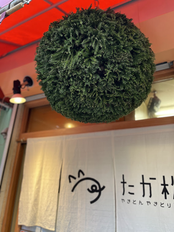 杉玉は江戸時代の宣伝広告です。杉玉の緑色は新酒が出来たことを知らせ季節の移り変わりで杉の色が変わりお酒の熟成度も変わるという広告手法です。現代の酒屋も飲食店も自分でつくることはせず業者から買ったものを吊るしているのでいつまで経っても色が変わらないものばかりです。たか松は毎年新しい直径60cm超の大きい杉玉をかけることができています。