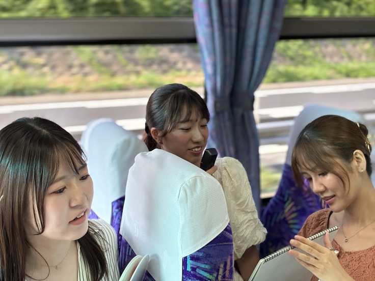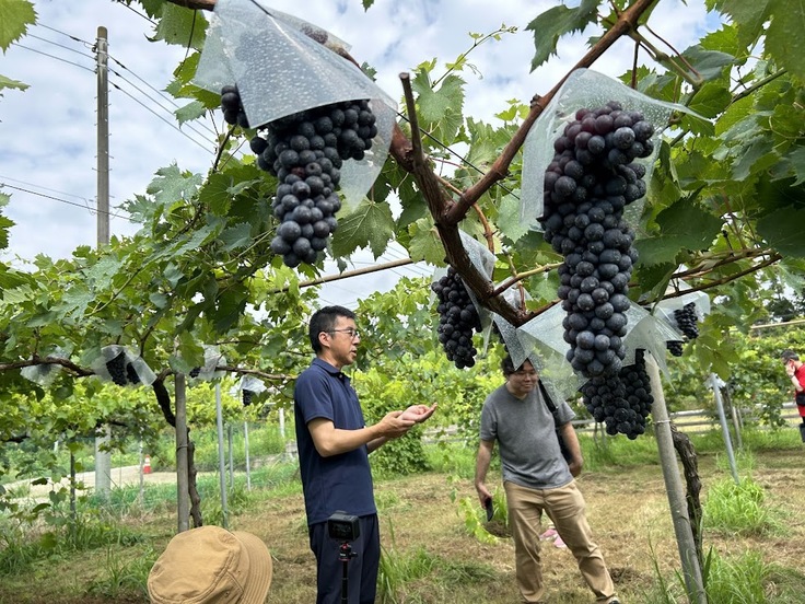 旭鶴田中社長の蔵案内↓山本社長の葡萄解説↓ バス車内でのクイズ出題 岩瀬酒造にて
