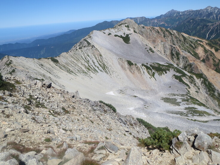 頂上にて足元を見ると氷河の浸食によって形成された圏谷(カール)に目が奪われます。六万年前と二万年前の北アルプス氷河期にできたもので、日本の圏谷では唯一の特別天然記念物「薬師岳の圏谷群」です。