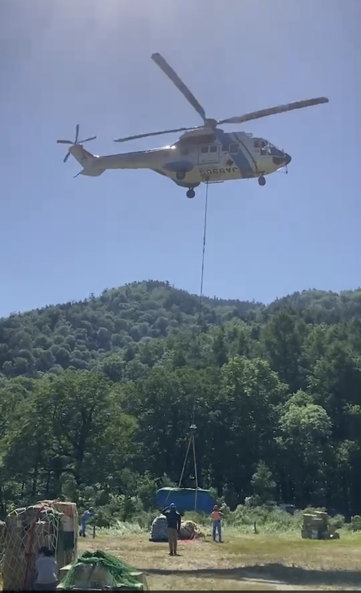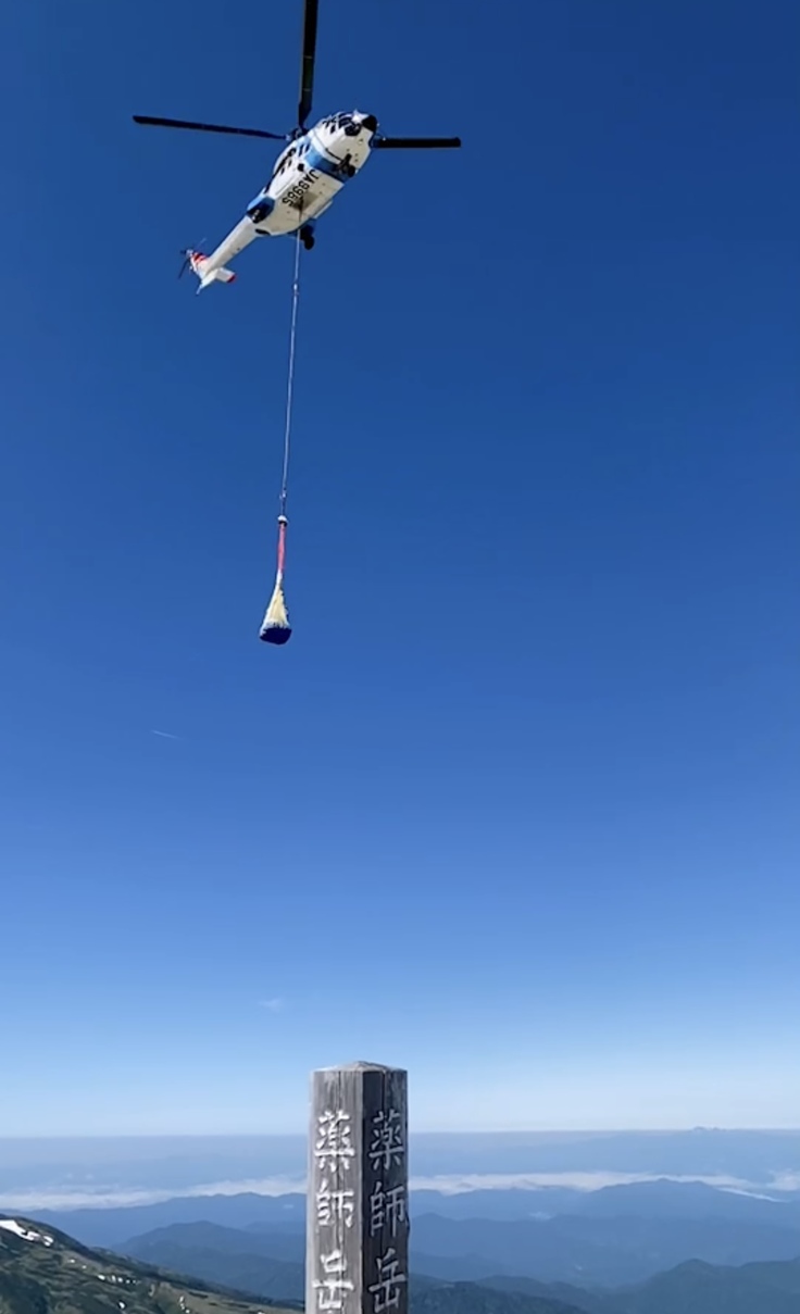 7月2日、この梅雨空が続く中、奇跡的な晴天となり、ヘリコプターにて資材が無事に山頂へ運ばれました。