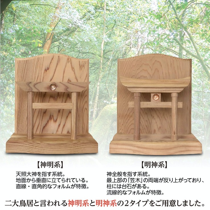 笠木(かさぎ)」と「島木(しまぎ)」から成る二層構造で、笠木の端が反っている形を取っています。神全般を指す系統で柱に台石があり、中央の「額塚・がくつか」に本水晶を配しました。