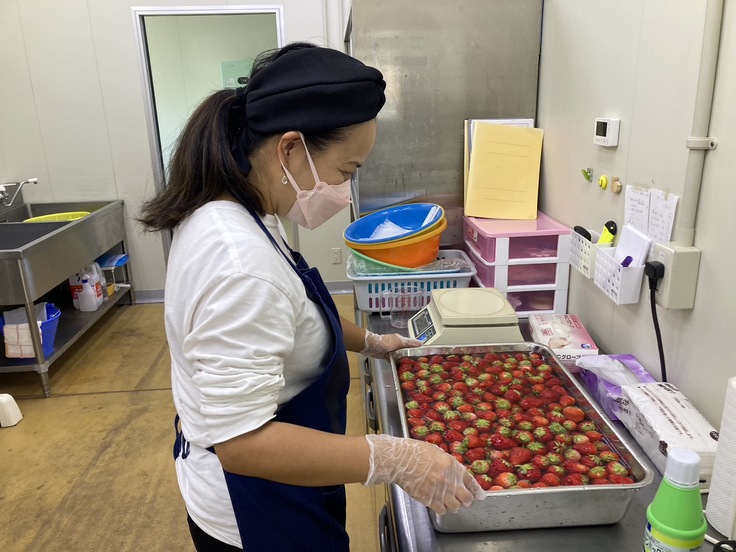 いちご農家さんから仕入れた いちごの下処理を行っています。