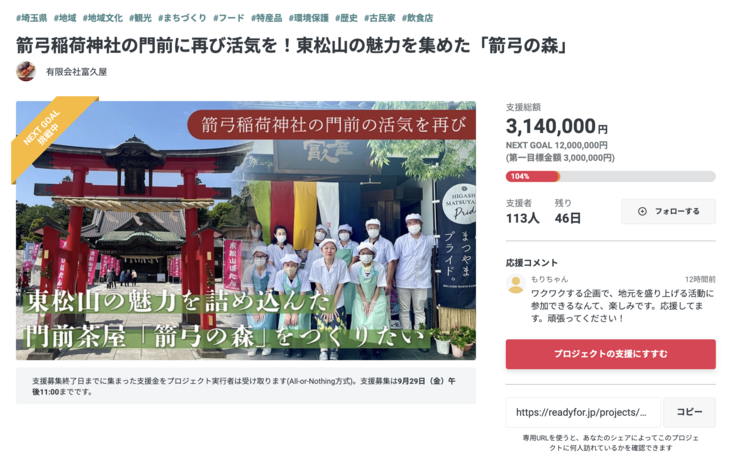 決して容易くない目標ではありますが、9月29日(金)23時まで一人でも多くの方にこの取り組みにご共感いただき、箭弓稲荷神社門前の再興の仲間となっていただけることを願って、挑戦を続けてまいります。