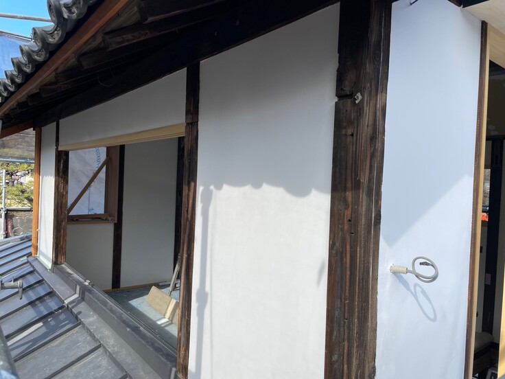 2階の外壁に漆喰、青空に白は映え、きれいに仕上がりました。
