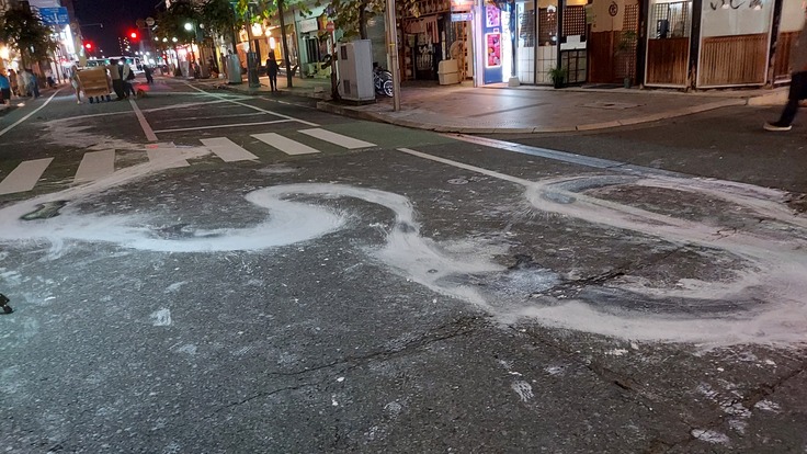 山形駅近くの大手門通りの商店街、通称「すずらん街」では『屋根のない美術館』というプログラムが行われていました。歩行者天国となった商店街で美術展示やパフォーマンスイベントが開催されていて、AR技術を使用した花笠音頭や、山形を流れる最上川を表現したチョークアートのドローイング作品をみることができました。