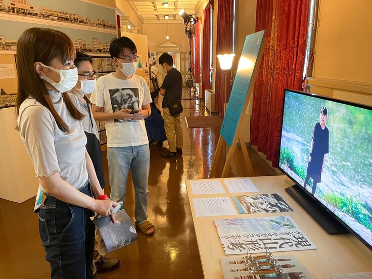 上演の舞台となった文翔館議場ホールの展示では、この展覧会のキュレーターである三瀬夏之介さんと宮本晶朗さんによるキュレータートークが行われました。このトークでは会場を巡りながら作品解説や展覧会にまつわるお話を伺いました。現代アーティストで文化財の保存修復をされている井戸博章さんの「現代風神雷神孝」の移動式修復センターの展示では、井戸さんご本人にから、文化財修復の現況や修復された風神雷神の木像についてお話を伺うことができました。文化財修復のみならず、何かを維持するということは、誰かが自分の身を使って引き受け、継いでいるからできることなのだと私は解釈し、身につまされました。