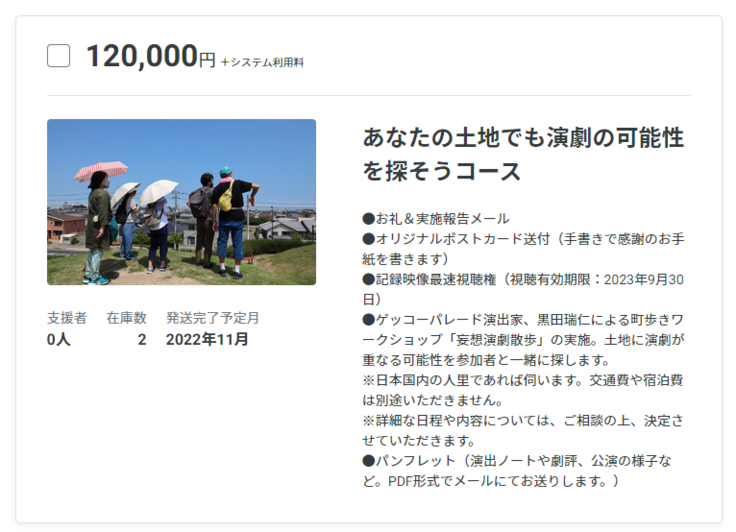 他コースと同じく映像視聴権やパンフレット(PDF)の配布にプラス、ゲッコーパレードメンバーの演出家・黒田によるワークショップ「妄想演劇散歩」の実施のリターンがあります。