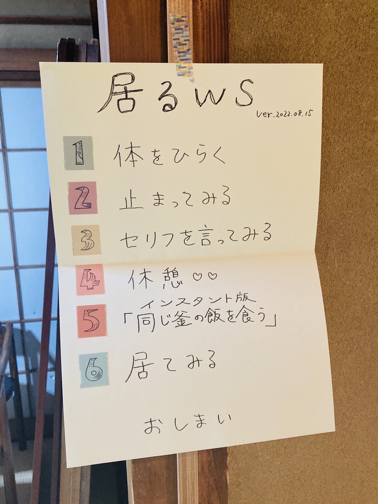 またある日は、出演者の一人、ダンサーの宮本悠加さん主導で、「居る」ワークショップをやりました。宮本さんは演出家・劇作家の三浦雨林さんと一緒に『そこに居るために』というプロジェクトを立ち上げ、舞台上を含めたいろんなところでどう「居る」かということを考え続けています。