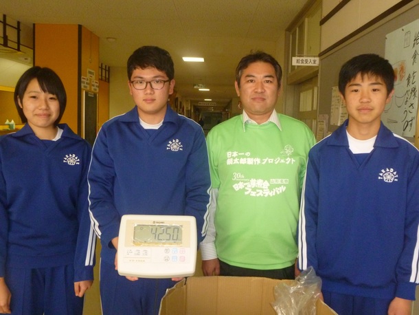 「日本一の鍋太郎製作プロジェクト」では、山形市内の小中学校からご協力をいただき、プルタブ回収を実施しています。先日は、山形市立高楯中学校の生徒の皆さんから42.5kgのプルタブをいただきました。児童・生徒の皆さんから回収していただいたプルタブは、三代目鍋太郎の製作に役立てられます。