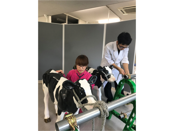 馬は性格が穏やかでありながら臆病な面も持ち、多くの学生が馬に触って診察の練習をすることは難しいです。また馬へのストレスも考慮し、実際の馬で実習を行うことは避けたいことです。