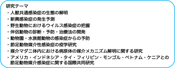 現在, ネコヘルペスウイルス1, イヌヘルペスウイルス, ウマヘルペスウイルス, ネココロナウイルス, イヌジステンパーウイルス, 日本脳炎ウイルス, 重症熱性血小板減少症候群ウイルスを主な研究対象としています。