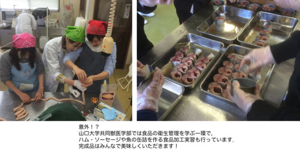 そこで山口大学共同獣医学部の公衆衛生学実習では, 食中毒の検査方法や, 肉・魚・牛乳の検査方法を学ぶことは勿論のこと, と畜場や牛乳工場を見学してHACCPプランを考えたり, あるいは自分たちで実際に食品加工を行うことで衛生管理を学ぶなど, 様々な内容の実習を行っています。動物を扱う実習に限らず, こうした様々な経験が出来ることも獣医学部で学ぶ楽しさの一つかもしれません。