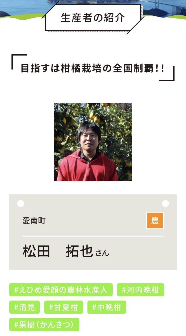 まず初めは、同じ愛南地区青年農業者協議会のメンバーで、愛媛県青年農業者連絡協議会の会長をしている松田拓也くん!