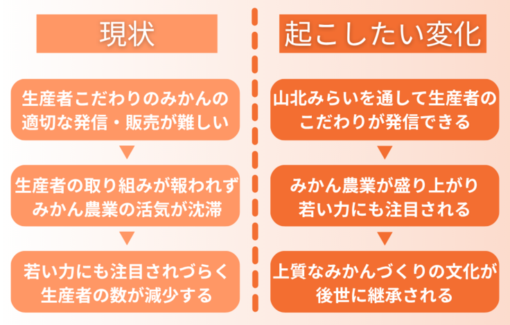 こだわり込めて生産された多様なみかんが、同じ一つのみかんとして販売され、その個性が埋没しているのが現状です。私たちは生産者に新たな販路を提供し、その個性・こだわりを発信できるようにしていくことで、再び産地に活気を取り戻し、みらいを描くことができると考えています。