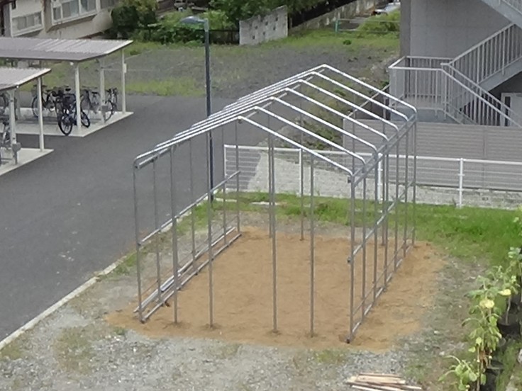 ハウスの組み立て作業を行い、大まかに完成しました。この後は、ビニールを付けていきます。