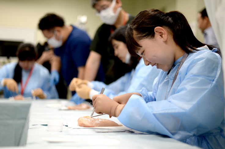 『事前に頂いた資料で縫合の速さが手術時間に大きく影響すると書かれており、なるべく速く縫うことを意識したらとてもほめていただき嬉しかったです。また様々な縫い方を教えて下さり興味深かったです。』