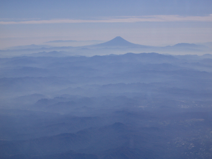 甲府盆地から見える富士山は御坂山系があるので上半分だけです。今夏は登山ができませんでしたが、例年の夏の夜にはご来光を見るための登山者の光の列を見ることができます。写真は釜山からの帰国便の機内から北陸地方の上空で撮影したものです。