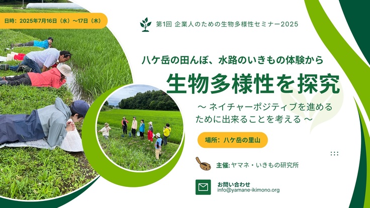 これは、企業で働く方々を対象にした2日間の体験型プログラムです。舞台は、山梨県北杜市・八ヶ岳南麓の美しい里山。田んぼや水路に息づくいきものたちを観察しながら、生物多様性と企業活動との関係を「ネイチャーポジティブ」の視点で見つめ直します。