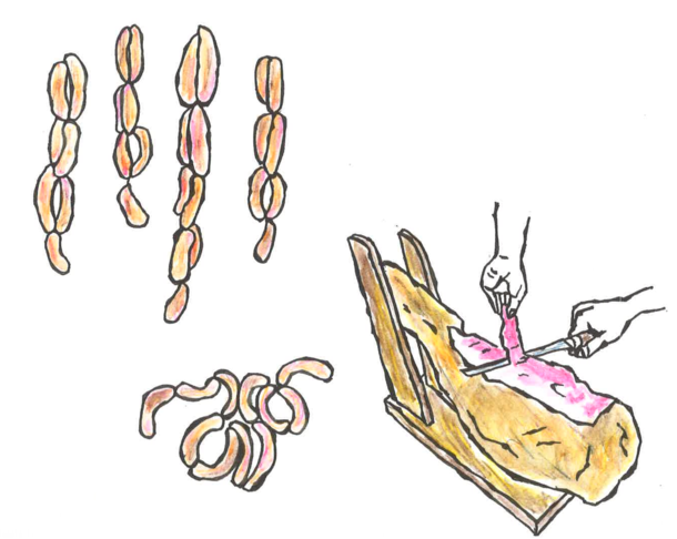材料となるのは秋田県産ブランド豚の骨付きモモ肉。作業説明の後に、モモ肉本体より整形、血抜き、塩漬けの作業をしていただきます。その後、生ハムを使ったランチをお楽しみいただいて終了となります(所要時間:約2時間)。