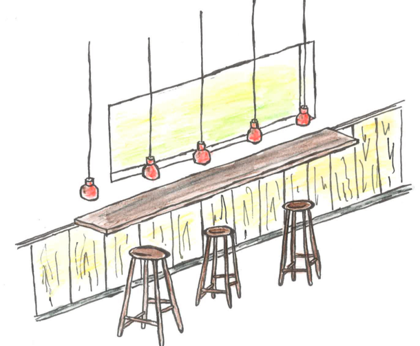 客席スペースは、約50帖の広さがあります。近くの古民家から譲り受けた梁材で作ったカウンターテーブル、山から伐り出した材料で作ったテーブル、イスとハンドメイド感満載の店内です。囲炉裏席もご用意致しました。