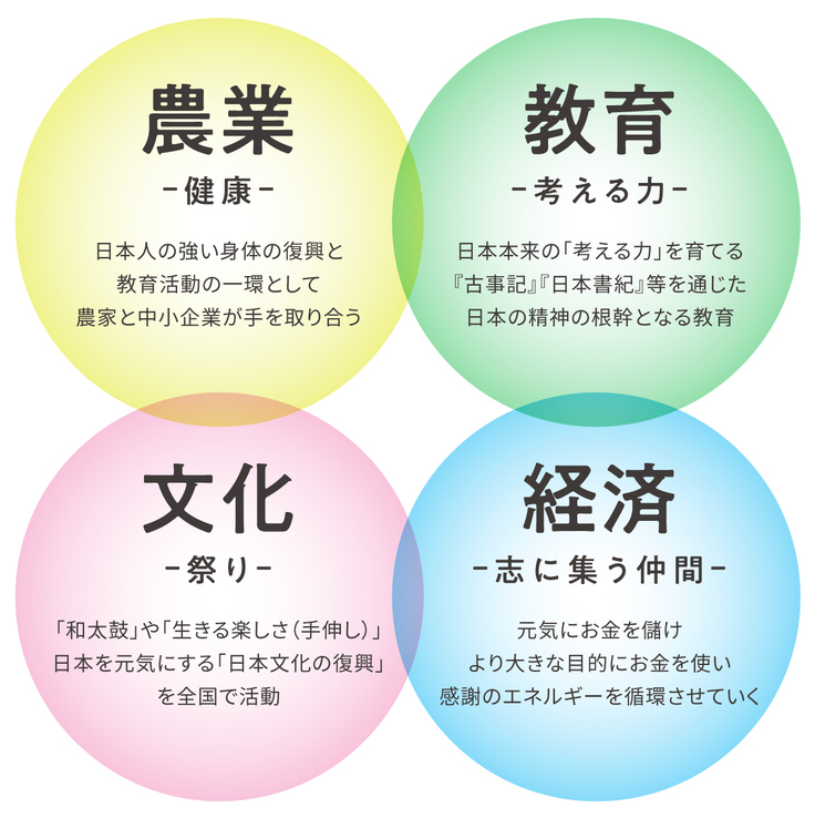 そこでわたしたちは、農業・教育・文化・経済の4つを柱に活動を始めました。特に日本人の生活の根幹を成す農業に注力。「半農半X」を実施し、農家さんと企業が手を取り合いながら、企業の業界枠、年齢の垣根を超えて多くのメンバーが一丸となって活動しています。