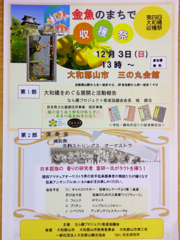 『第四回大和橘収穫祭』を大和郡山市 三の丸会館にて開催いたします。12月3日(日)13時より、第一部は「大和橘をめぐる展開と活動報告」第二部はクラシック演奏会です。皆様、お誘い合わせの上、ぜひお越しください。