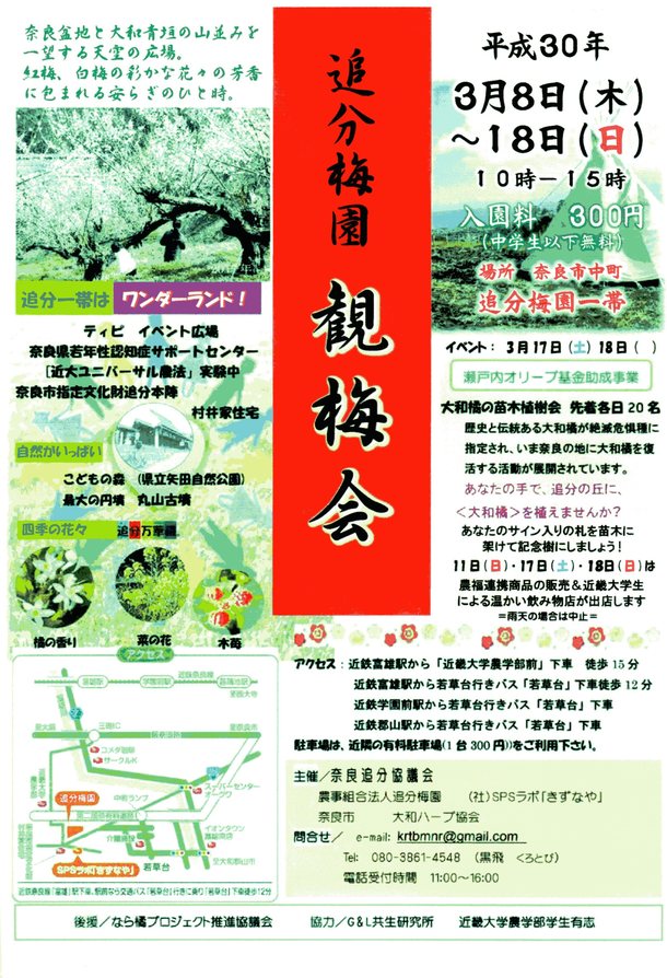 来る3月17(土)と18(日)に追分梅園(奈良市大和田町1912)観梅会にて、大和橘の苗木の植樹会を行います(両日先着20名様 無料)。