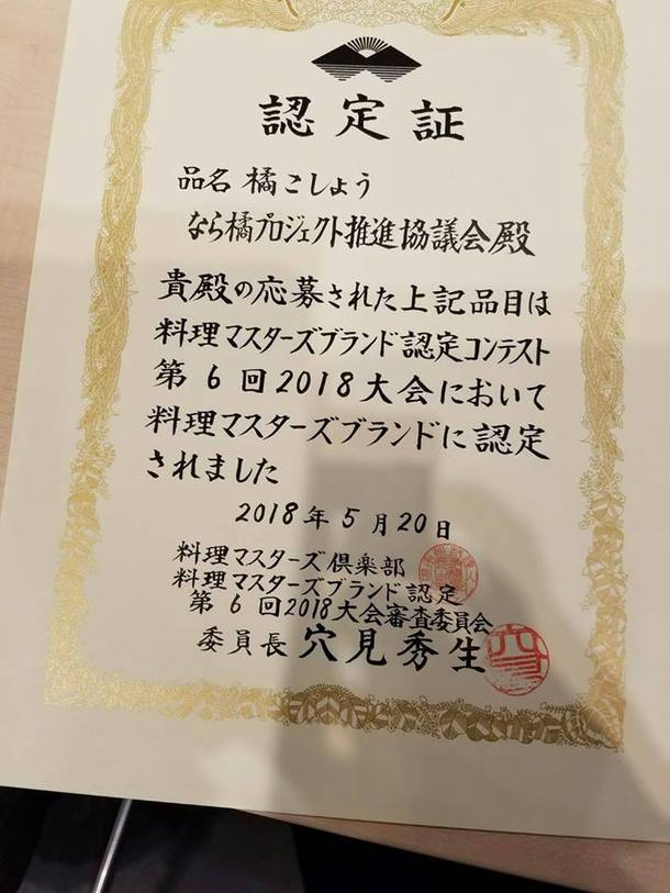 5月20日に開催されました『料理マスターズブランド認定コンテスト第6回2018大会』におきまして、橘こしょうがブランド認定されました。一次、二次の厳しい審査を、一流のプロの料理人ら(料理マスターズ受賞者)が行い、優れた食材を選定し、
