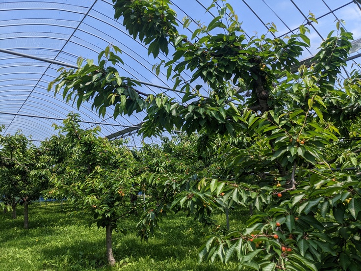 収穫が近づくにつれさくらんぼの実は雨にとても弱くなり、雨に当たると果皮に亀裂が入り割れてしまうためです。