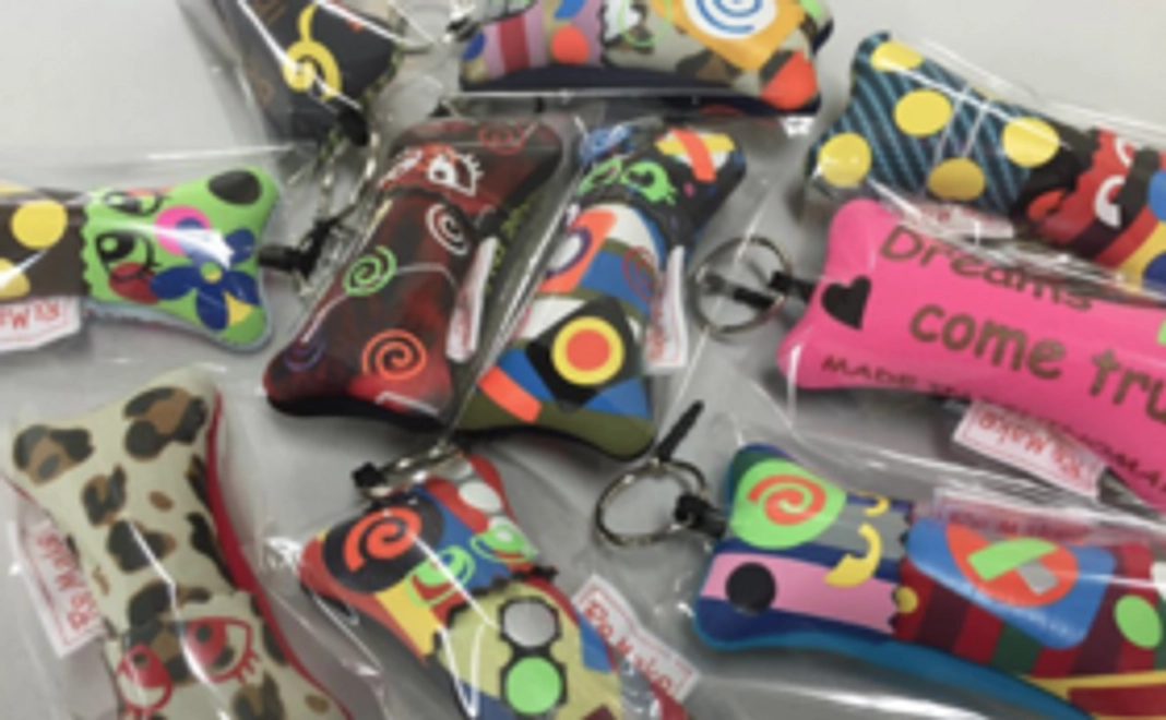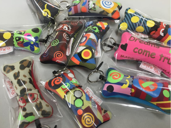 石巻はウエットスーツ生産日本一の街なんです。このキーホルダーは、ウエットスーツを作るに際に発生する端材を使って、石巻で作られています。ファン・クリエーション社さんは、日本一のウエットスーツメーカー・モビーディックの子会社です。ファン・クリエーション社さんの、ウエットスーツの端材を使った小物づくりには、山崎ゼミが関わっています。