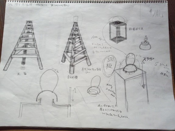 この活動に本格的に取り組むきっかけとなった「戦前の灯台」のはなし。「昔の灯台はね、木の電柱を三本組んで、梯子みたいに角材を打ち込んで…」というおじいの話を聞き、それをスケッチブックにエンピツで描き起こして、見せにいったんです。そうしますと「そうそうこんな感じ、もうすこし梯子の段が少なかった」と具体的な話に。「上には灯油のランプを載せていた、どのようなランプだった、かたちはこうだった、ああだった…」というのを描き繰り返して、人々の記憶を元に、どんどん解像度を上げていく。そして写真には全く残ってない灯台の姿が浮かび上がりました。