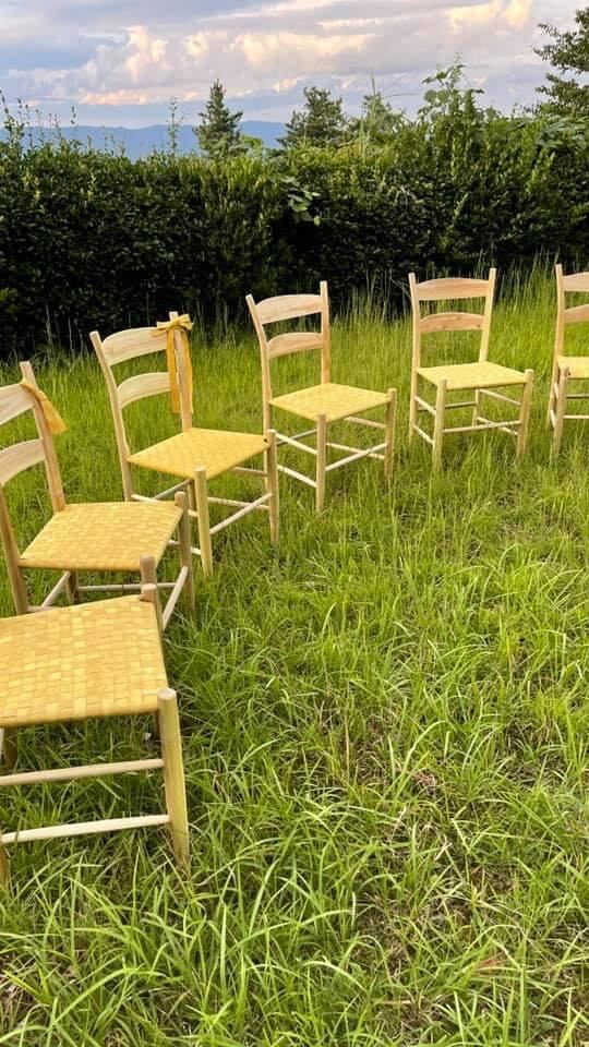 キハダは、古くから山添村でも栽培され、樹皮の黄檗(おうばく)は陀羅尼助などの漢方薬の原材料として活用されてきました。数年前より、黄檗を剥かれた後の木部を活かした椅子作り『キハダのラダーバックチェア作り』が行われています。山添村木工館の松村朋子さんが主催し、NPO法人グリーンウッドワーク協会の小野敦さん、椿ゆかりさんを講師に迎え行われ、毎年全国から参加者が集まっています。