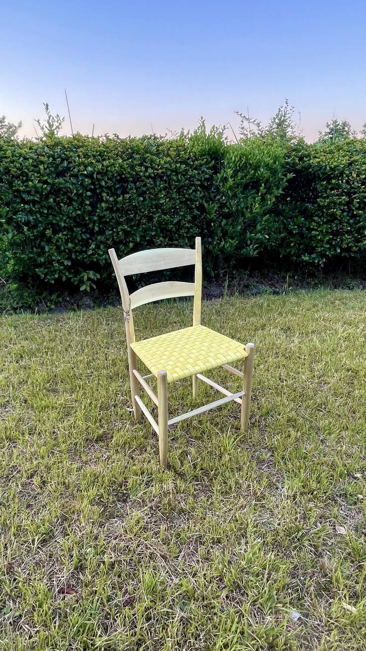 丸太を割り、銑(せん)という鉈(なた)の両端に持ち手がついたような道具で木の表面を削り、椅子の部品を作り、組み立て、キハダで染め上げたテープで座面を編み仕上げます。