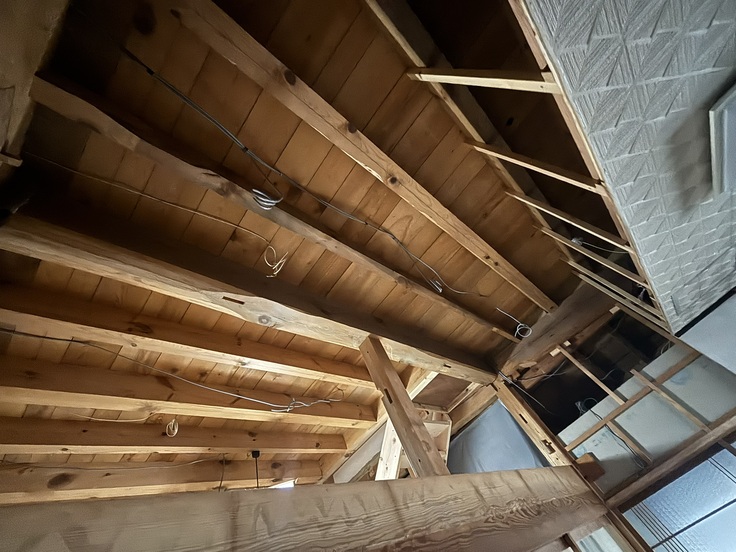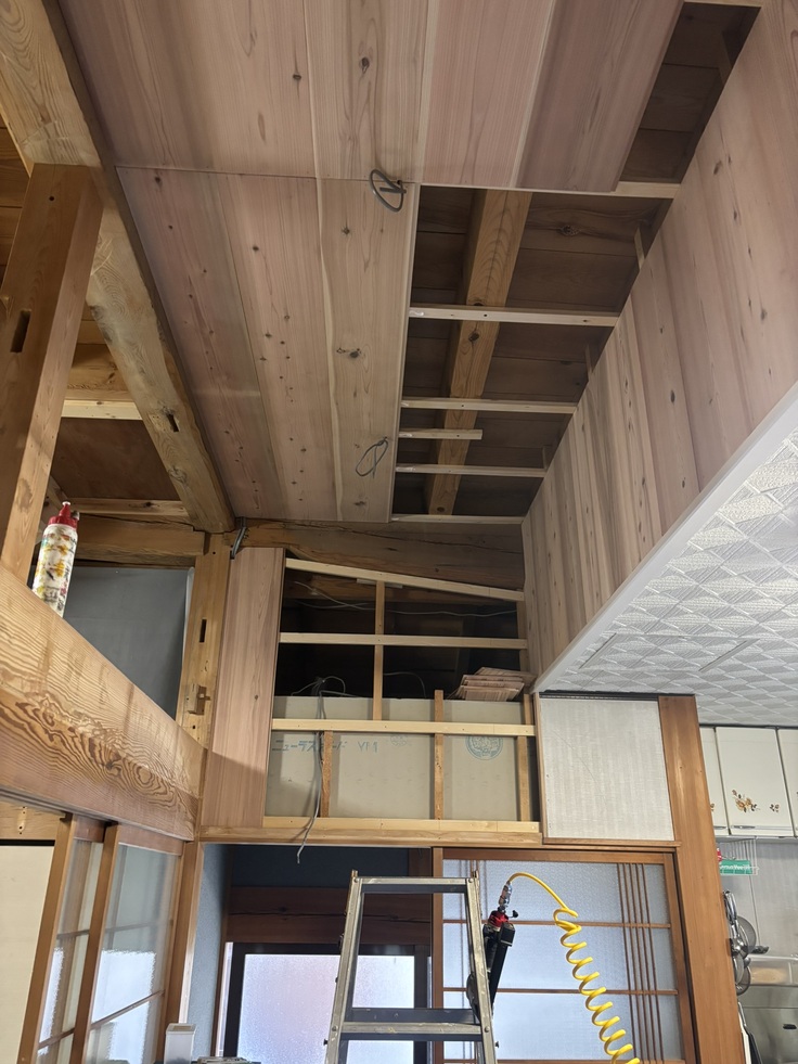 ゲストをお迎えするレセプションとなるお部屋を開放感のある空間にするために、天井板を取り払い天井高を上げる作業を行いました。少しの終い作業を残して、2月中には仕上がる見込みです。