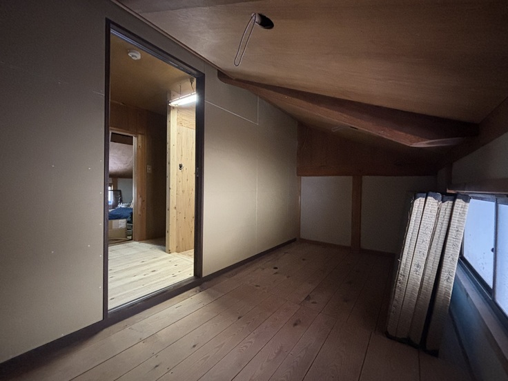 押し入れの天井裏が広々としていることがわかり、大工さんの提案で新たにつくることになったユニークな小部屋です。許可がとれれば、客室として活用する予定です。あとはクロスを貼れば完成です。
