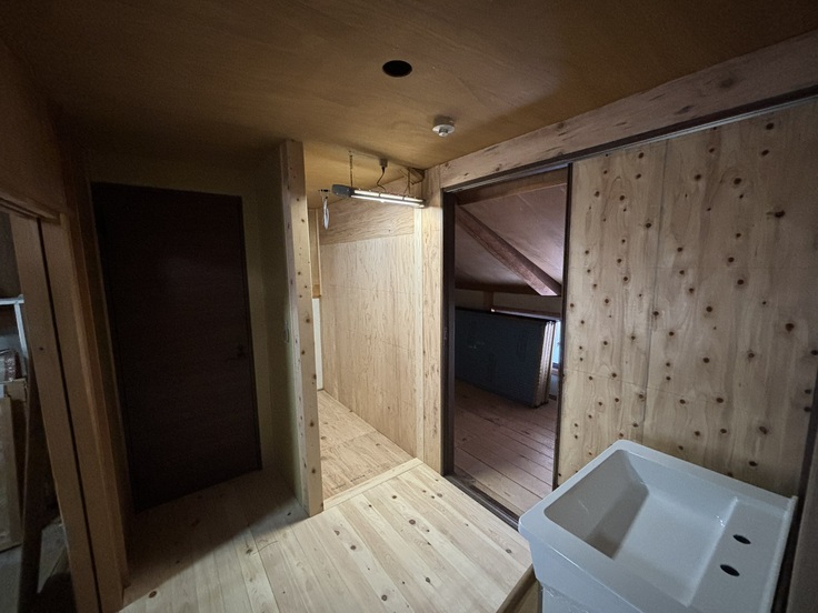 増築をともなう整備で、この工事で最も難航した場所です。日本家屋ゆえ、いびつな形状や寸法の不規則さに大工さんにも四苦八苦しておられました。予定より工期がかかりましたが、大工工事は無事完了し、ボランティアの方にクロス貼りを行っていただきました。あとは給水の開通を待つばかりとなっています。