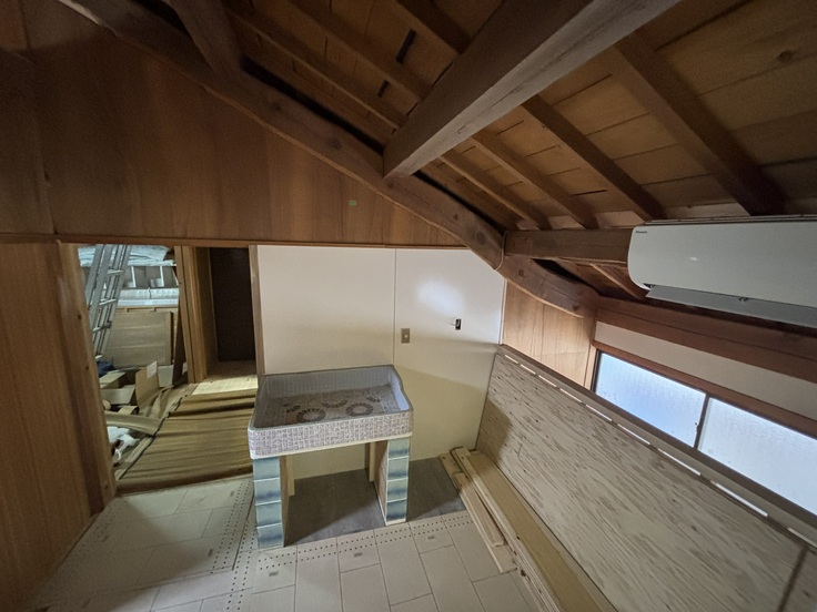 屋根裏部屋風の秘密基地のような空間を、宿泊した方がゆったりと過ごすことができるラウンジに改修しています。簡易な調理ができるキッチンもつくり、山添村での長期滞在を応援します!!防音や床貼りの工事は完了しており、照明器具の設置や天井の終い工事を残すのみとなりました。