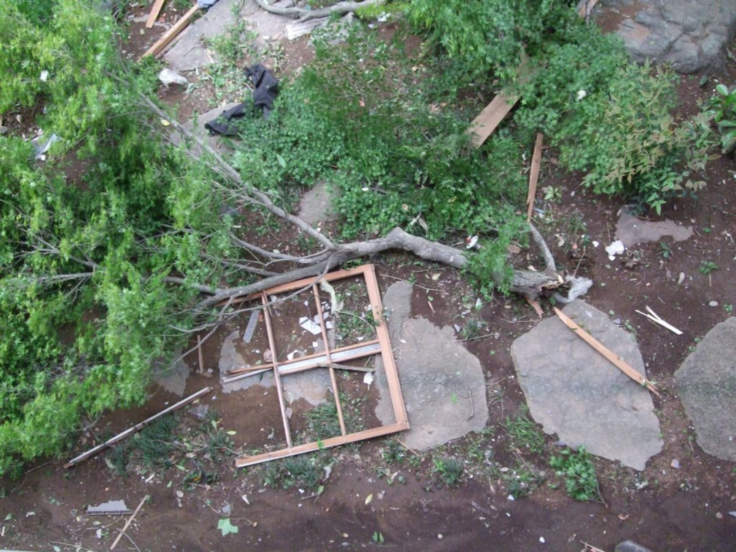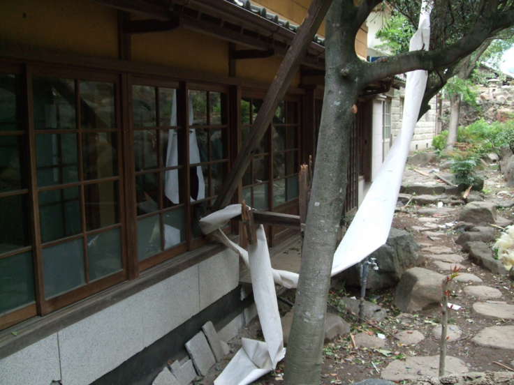 The tornado shattered dozens of glass windows all of which miraculously withstood the 2011 earthquake. Both inside the mansion and the garden had debris everywhere.