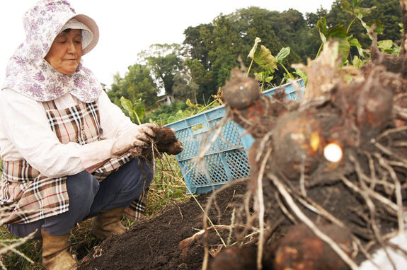 地元のおじいちゃん・おばあちゃんが作る里芋がどんどん減っていている現実と、時間の経過と共に忘れ去られていく地域特産の美味しい里芋。里芋の栽培には大変な重労働が伴います。一言で言い表せば「土と格闘する」が一番近いのかもしれません。畑で必死になって作業をしていると、その道ばたでじっと作業を見守るおじいちゃんやおばあちゃんがいます。「葉っぱの色が少し薄いかもしれんよ!」とアドバイスを言ってくれ、昔の人は、作物を見れば、その状態がわかるんだなぁと実感する日々です。地域を豊かにすることは、新しいものばかりではありません。地域の農業と生産者が少なくなった特産里芋を守り、大先輩の思いに報いるため、この里芋で地域を元気にしていきたいと思っています。