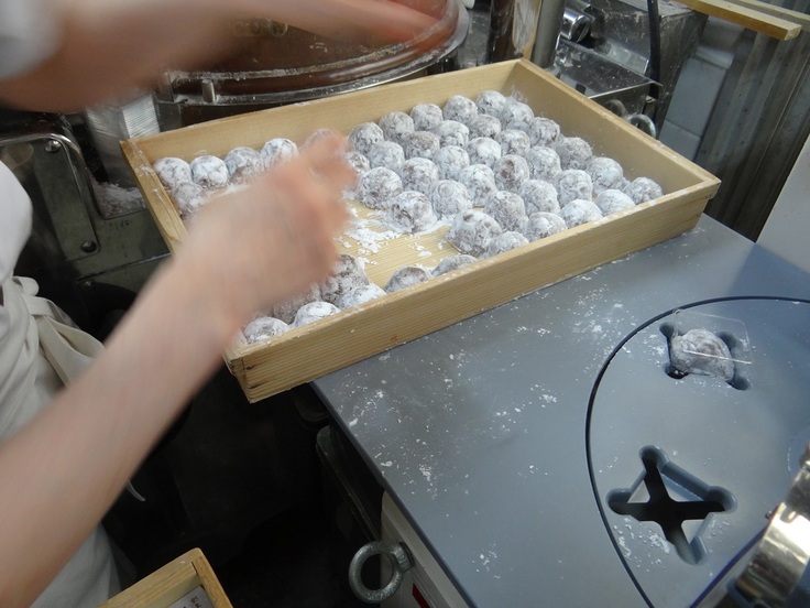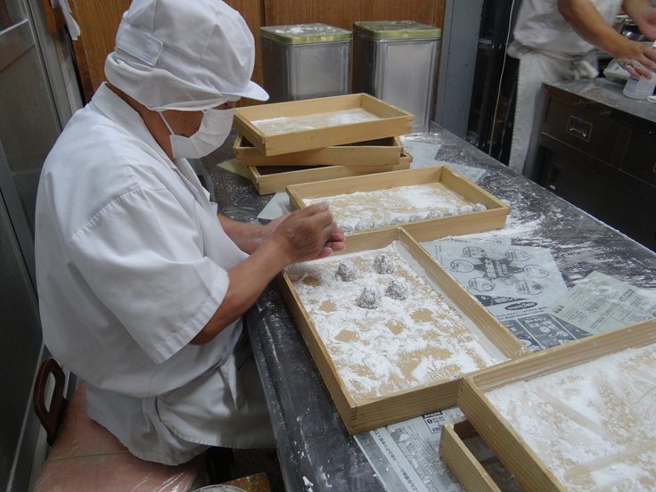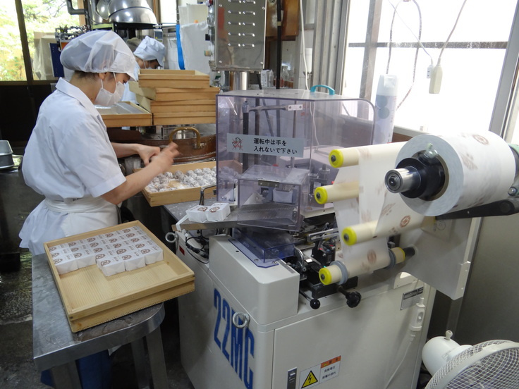店舗に隣接した工場内での肉桂餅(にっきもち)の製造風景