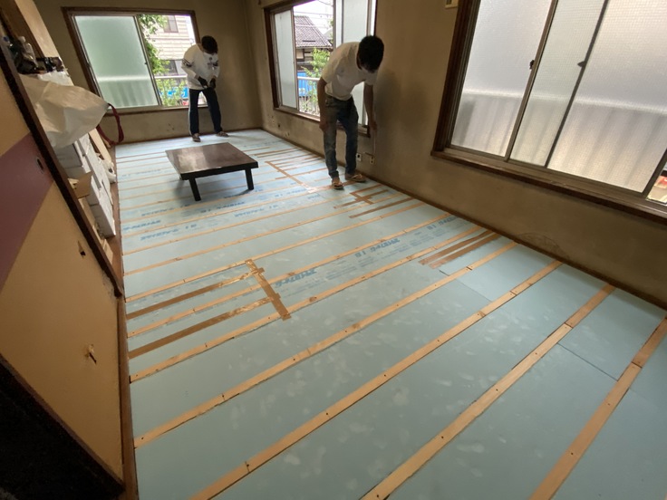 下には断熱材を詰めます。と文字にすると簡単なのですが、ここに一番時間をとられてしまいました、、、。しかしこれがないと寒くてしょうがないそうです。