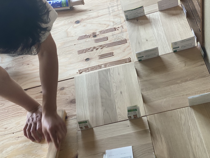 この床なら寝っ転がりたくなっちゃうかな、ここにソファを置いて、あ、そしたら通る人の邪魔かな、じゃあここに机かな、、、