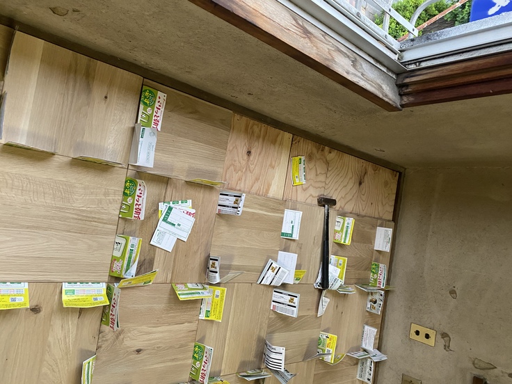 残りのスペースに合わせて木をカットするのですが、建物自体が少し歪んでいるので、ひとつひとつ測って調整しながらはめていかないといけない。