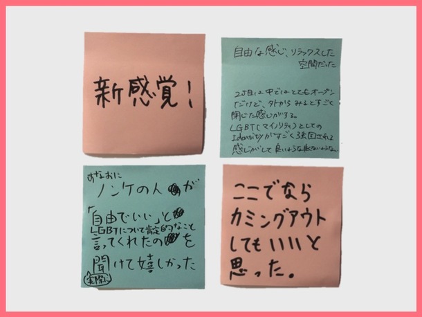 「今までゲイの友人にしかカミングアウトしたことがない」というゲイの方が、「ここでならカミングアウトしてもいいと思った」と書いてくれたことは、本当にありがたく、勇気をいただきました。