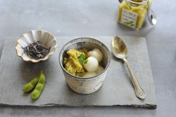 ③ ②を水切りし、器に入れてえだまめ生姜ジャムをかけ、セルフィーユを